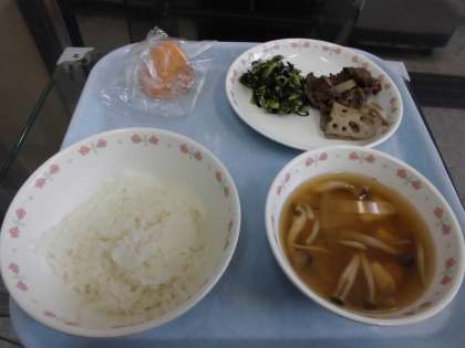 ごはん 牛肉とれんこんの煮つけ だいこん葉とじゃこのいためもの 秋の恵みのみそ汁 柿