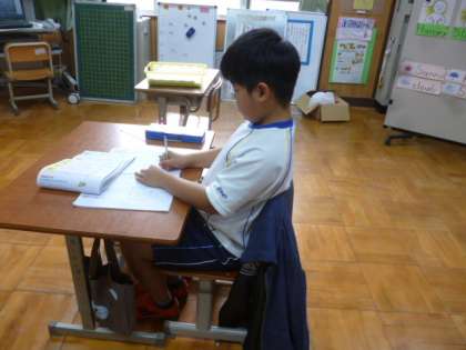 最近,学習中の姿勢を意識して指導しています。毛筆書写の学習での姿勢を意識して,他の教科の学習中にも,姿勢よくていねいな字を書くように声かけをしています。昨日,子どもの方から「新しいめあてを考えました。足をぶらぶらさせないです」という意見が出て,新しいめあてとして姿勢を意識するようにしています。まだまだよい姿勢で書く時,書けない時があるなど姿勢については,定着には至ってませんが,より丁寧に字を書こうという意識が見られるようになってきました。意識してがんばっていることを伝え,姿勢についての意識も高めていきたいと思っています。