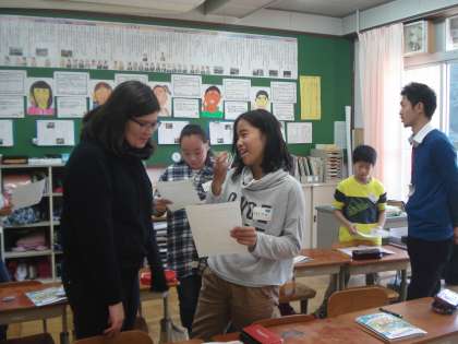 5年生、6年生の英語活動では、イギリスからの留学生の方に加わっていただいて授業を進めています。あいさつをしたり、クイズやゲームをしたり、日本とイギリスの昔話について考えたり、楽しく一緒に学習しています。