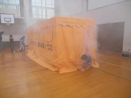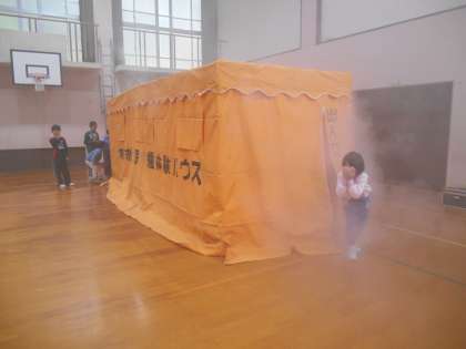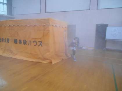 煙体験もしました。前が見えないことや煙を吸わないように体を低くして進め体験をしました。日ごろから、ハンカチをさっと出せるようにしておくことの理由の一つでもある体験でした。