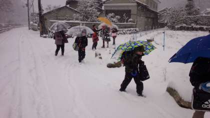 冷たい朝が続いていましたが、いよいよ雪が積もりました。静原の子たちはもう慣れっこのようで、朝から元気よく雪で遊んでいました。
