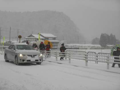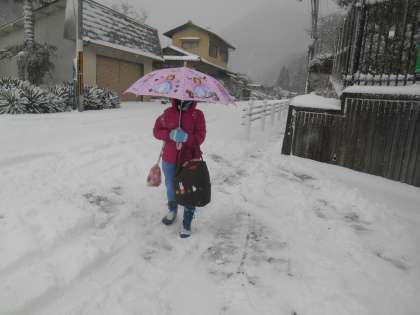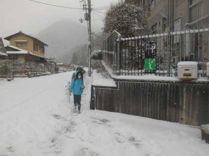 雪が降り、車はライトを点灯させて走行しています。雪道も自分で、傘をさししっかり登校しています。こじか文庫のひです。返却用の本も持って登校しています。