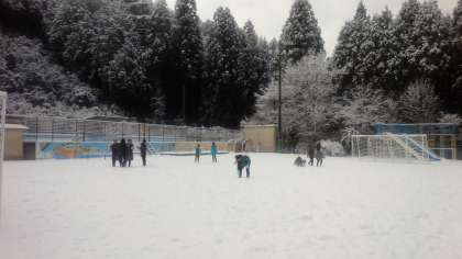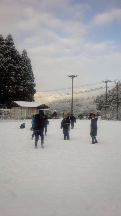運動場に出てきた子どもたちは楽しそうに雪合戦を始めました。生きチャレの中学生も元気に子どもたちと遊んでいます。空は青空、子どもたちは元気です。