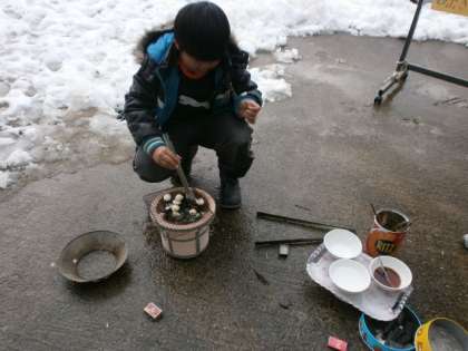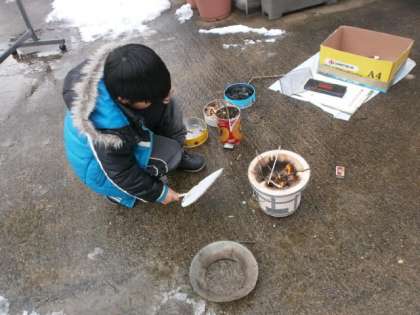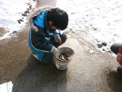 今日の3・4時間目に,社会科で,先週徳岡さんに教えていただいたことをふりかえりながら自分で七輪を使ってお餅をやきました。手順を模造紙でふりかえったり,ビデオで確認したりしながら七輪に火をつけました。直接教えていただいたことがとても心に残っているのか,しっかりと手順を覚え,お餅をやくことができました。一生けんめいにうちわを使い,炭に火が起こった時はとても感動している姿が見られました。
