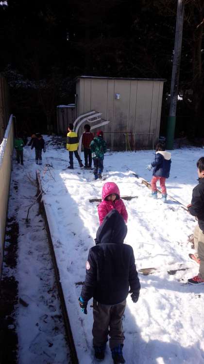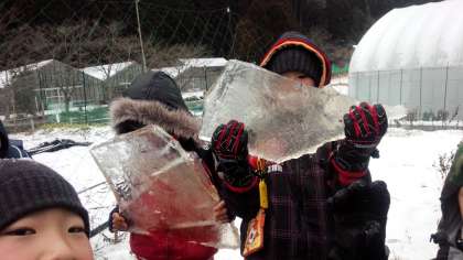 今冬一番の冷え込みに、道や池が凍っていました。雪は先日ほど降らず、子どもたちはちょっとがっかりしているようでしたが、今冬一番の氷の厚さに驚いていました。