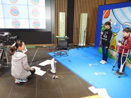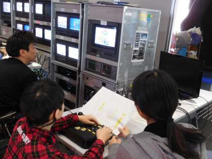 はじめに模擬番組づくりでキャスター,リポーター,CG操作などやくわりの説明を聞き,実際に役割分担をして模擬番組作りをしました。後半は自分たちで準備し進めてきたもち米づくりと感謝の会をテーマにした番組作りに挑戦しました。リハーサル,本番と緊張したと言っていましたが,やりきった充実感や達成感はそれ以上に大きかったことと思います。