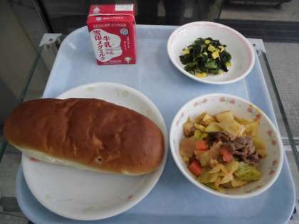 おさつパン 牛乳 ボルシチ ほうれん草のソテー