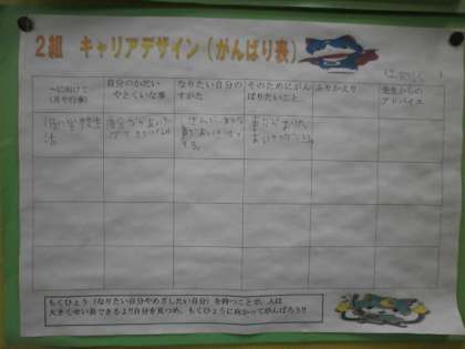 今,キャリアデザインで目標にしていること。それは,「自分から大きな声であいさつをすること」です。最近,毎朝,大きな声で自分からあいさつをすることができるようになってきました。今朝も教頭先生からほめていただきました。目標を決め,目標に向かってがんばろうとする気持ちが素敵です。