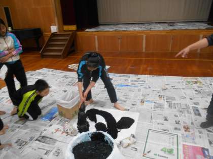 卒業を前に自分の気持ちを表す漢字一文字を書き、作品にします。床にいつもよりはだいぶん大きな紙に、筆を全身を使って動かして書きます。空中に漢字を書いて書き順を確かめて、いっきにかけるようにします。