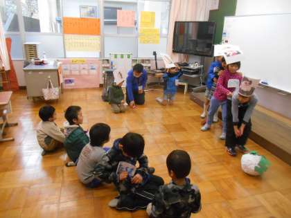 新1年生を迎えて,張り切って出し物をしていました。速く1年生になりたいという気持ちをふくらませました。