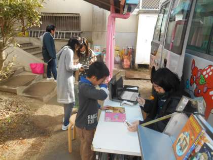 こじか文庫を楽しみにしています。予約をしての注文も慣れたものです。松葉つえを突きながらも、こじか文庫を見に来ます。運動場で走り回れない分、読書をがんばるのでしょう。大人の安全確認のもと階段を昇降します。