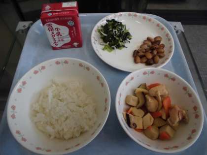 麦ごはん 牛乳 高野どうふと野菜のたき合せ とら豆の甘煮 だいこん葉とじゃこのいためもの