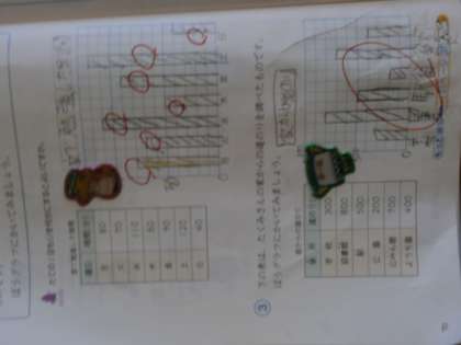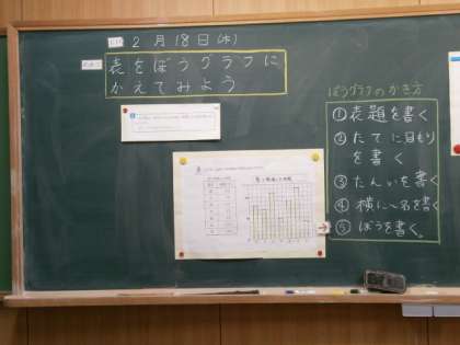 今,算数の学習では,「表とグラフ」の単元の学習を行っています。昨日,今日とぼうグラフの書き方を学び,いろいろな表を見ながらぼうグラフをかきました。書き方の順序を掲示することで,確認しながらしっかりとかくことができます。また,何度もくりかえすことで,自然にかき方が身につきます。以前社会科で行ったお買い物アンケートの結果もぼうグラフに表しました。