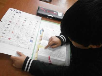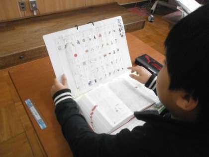 最近,よく「辞書で調べていいですか?」という言葉を聞きます。前期に国語の学習で辞書の使い方を学んでから,自分で調べた言葉にはふせんを貼り,どれだけ調べてきたか,今まで調べた言葉は何かが分かるようにしてきました。前期は,「意味の分からない言葉」に出会った時だけ活用していましたが,最近では,「漢字」を調べたい時にも,活用するようになってきました。辞書で調べる際に,「はしら」を見て,また,ひらがなの一覧表を見ながら,「この言葉はもう少し後のページだな」など考えながら辞書を使えるようにもなってきました。小さいことでもつみ重ねていくうちに自然と身につくようになります。誰かに教えてもらうのではなく,自分で調べた言葉だからこそ,より定着もすると思います。