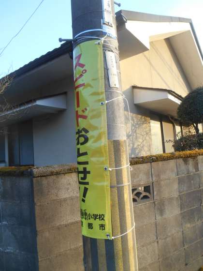 通学路交通安全啓発電柱幕が新しくなりました。学校の前をスピードを出して通過する自動車、横断歩道の信号が青になり児童が渡ろうとするのに自動車が赤信号で通過することもあります。注意して自動車運転してもらえることにつながることを期待します。