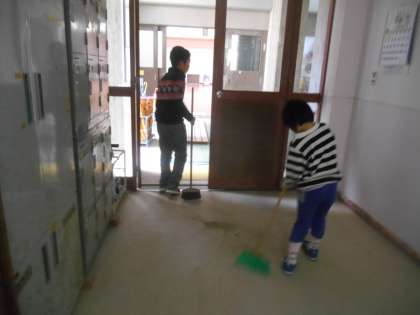 校舎の出入り口の掃除