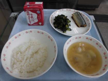麦ごはん 牛乳 さんまのしょうが煮 ほうれん草のおかか煮 いものこ汁