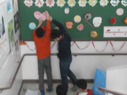 廊下や1年生教室の掲示をしたり,体育館の用意をしたりしました。