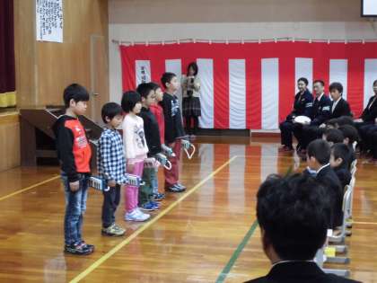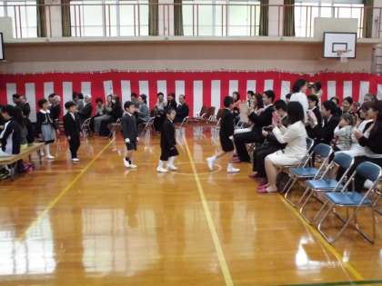 新入生へのプレゼントとして在校生からお迎えの言葉と鍵盤ハーモニカの演奏がありました。月曜日からすぐに仲良くなって一緒に運動場を駆け回ることでしょう。入学式を終えて新入生は教室へと向かいました。