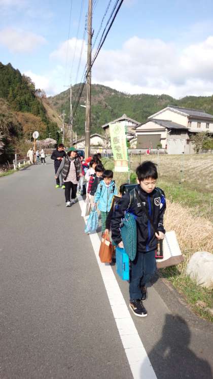 集団登校場所にみんなが集まってきます。今日から新1年生も集団登校です。保護者の方や地域の方に見送られて出発しました。先頭の6年生が3月よりもゆっくり歩き、みんなそろって列を作りしっかり歩けました。今日から勉強も始まります。