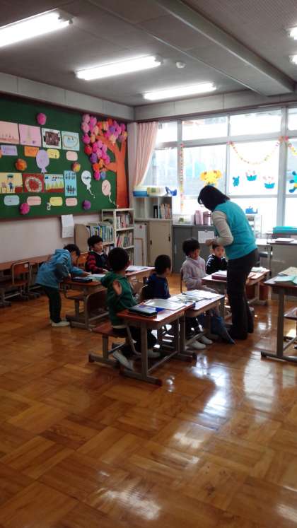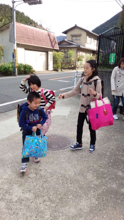 静原小学校の集団登校は学校より西からくるグループと東からくるグループの2つのグループに分かれています。2つのグループが到着し、それぞれの教室に入っていきます。1年生は早速教室で担任の先生とお話ししていました。