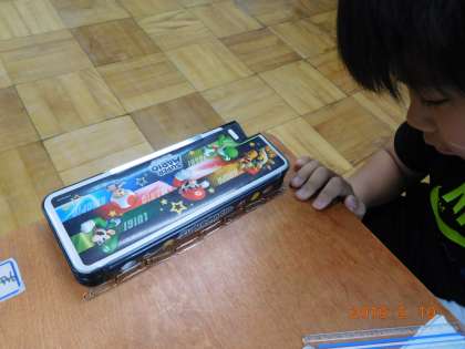 身の回りのものの長さを調べようとクリップやブロックを使って行いました。