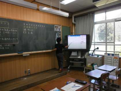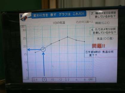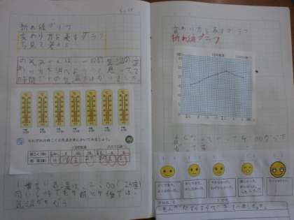 今日の3時間目の算数の時間に「折れ線グラフ」について学習しました。今,理科で学習している「天気と気温」に関係する1日の気温の変化が分かる表を見て,気づいたことを話し合い,その後に,変わり方がよく分かるグラフとして「折れ線グラフ」があるということを伝えました。折れ線グラフの読み方を伝える前に,「あっこのグラフなら一番高い気温の時間がすぐ分かりますね」といった,グラフの特徴をとらえた発言をしていました。電子黒板でグラフの読み方を確認したり,ノートに資料を貼って,気づいたことをノートに書いたりすることで,よりグラフについての理解が深まりました。