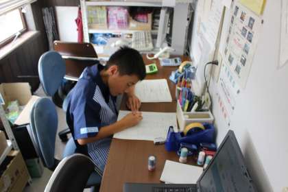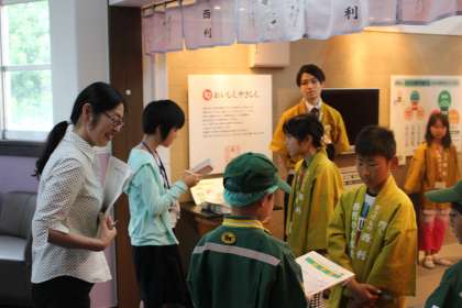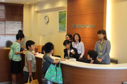 ショッピングと仕事を順番に経験をします。はじめのショッピングタイムは,住民登録や電子マネーの振り替えなどをすませます。会計担当の役割は,外から見えない場所で,給料表など書類の作成をしています。