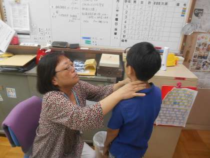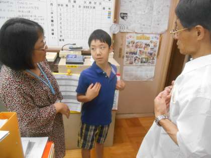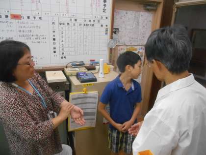 理科の学習で、保健担当の先生に、脈拍の調べ方について教えていただきに行きました。首の所でも手首でもとれます。内蔵のある場所も実際の体でこのあたりという事も教えていただきました。