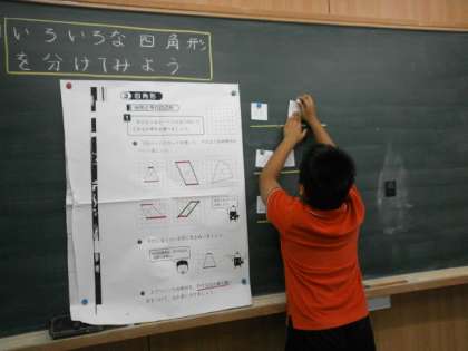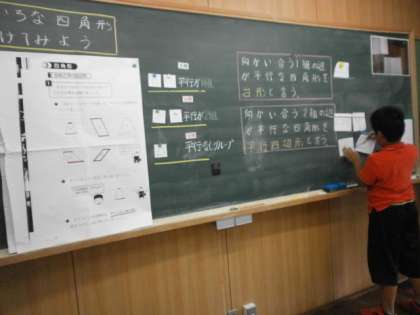 今日の1時間目の算数の時間に,「四角形」の学習を行いました。いくつかの四角形を見て,「平行の数」に注目しながらグループ分けをしました。その後,向かい合う1組の辺が平行な四角形を「台形」,向かい合う2組の辺が平行な四角形を「平方四辺形」ということを学習し,たしかめとして,数種類の四角形を,台形や平行四辺形に分けていきました。自分でグループ分けをしたことで,「平行の数」に意識が向き,それぞれのちがいを理解することができました。次は,台形や平行四辺形の特徴をとらえていきたいと思います。