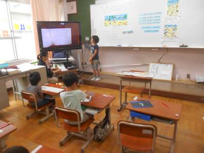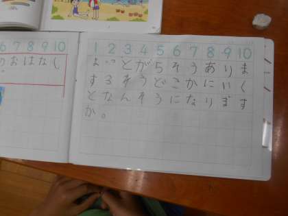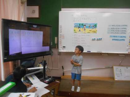 5−3になる問題を考えてノートに書き、発表します。あっているかどうかみんなでしっかり検証します。ひょげん方法が人によって違います。あれっと、思うと質問をします。それでどうかみんなで考えます。ノートを拡大して見てもらいます。しっかりかけているかも評価されます。消しゴムの消し方をもっと丁寧にしないと跡が残って見にくくなるという意見も出ますが、言われた方も素直に、改善しようという返答をします。より良いものを求めていこうという意識で共通理解できています。