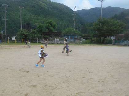 てつなぎ鬼をしています。水泳の前の時間のクラスもありますが、靴をはいて必死で走っています。