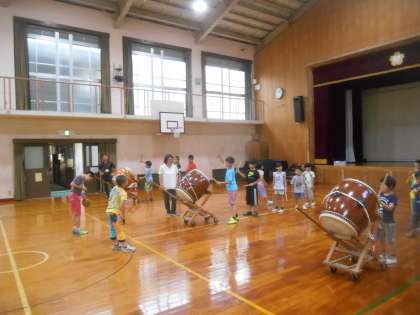 田の虫送りに向けて、太鼓の練習をしています。太鼓がリズムよくしっかりと演奏できるようになる事を目標にしている低学年、鐘をたたけるようになることを課題にしている中学年、か学年にうまくなってもらおうとして取り組む上学年。自分の課題に向かって頑張っています。練習時間は短いので、給食をさっさと時間通りに終わらせて練習に臨む姿もあります。
