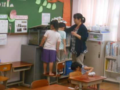 生き物ランドの生き物へのエサを放課後とっていて入れています。生活科の中でもしていましたが、明日は、学校が休みになります。エサがなければ大変なことになると考え、自ら行動に移したのでしょう。