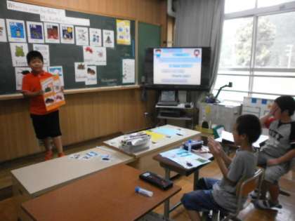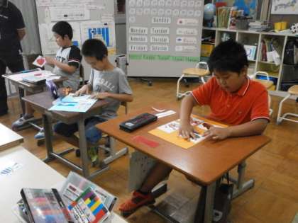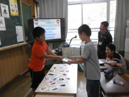 今日の5時間目の総合的な学習の時間に,英語学習の「MYカレンダーを作ろう」という単元の学習をしました。自分の誕生月に関係するカードを選び,友達同士で「What card do you want?」「Iwant〜」のやりとりを行いながら,カードを受渡しをして,カレンダーを作成しました。くり返し,渡す役,もらう役を行うことで英語表現になれていき,元気よく「Hello!]と声をかけ合う姿も見られました。それぞれがオリジナルのカレンダーを作ることができ,「楽しかったです。また,やりたいです。」と言っていました。できたカレンダーはまた,掲示しておくので,ご覧になって下さい。