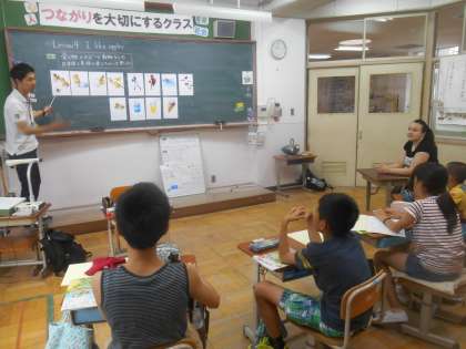 好きなものを言いながら、自己紹介につばげます。そのために好きな食べ物やスポーツ、生き物などの名前を楽しみながら覚えていきます。嫌いな物についても、嫌いであると言えるようにします。この日は、外国語指導助手(FS)に〜は好きですかと英語で尋ねると嫌いばかりの連続で、人それぞれであると実感しました。