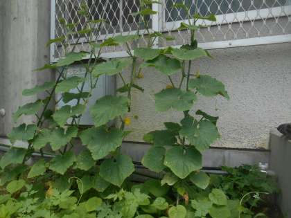 緑のカーテン。キュウリが少し伸びてきました。