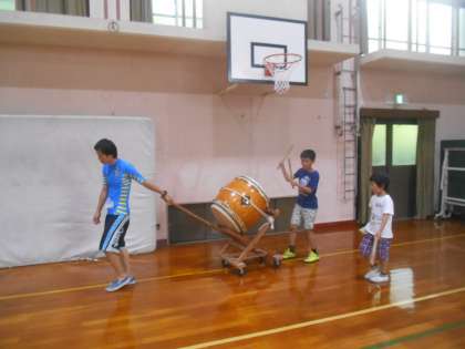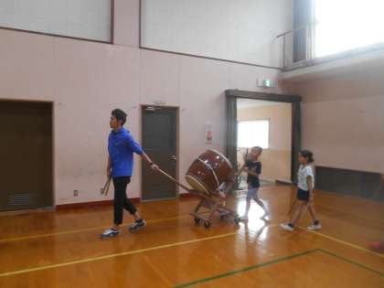 太鼓の練習をしています。田の虫送りは7月14日の夜の太鼓を叩きながら静原を回ります。松明をもと人もいますし、太鼓をたたく人もいます。動く太鼓をたたく練習を始めています。