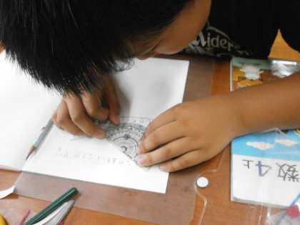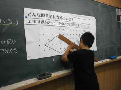 今日の1時間目の算数の時間に,ひし形についての学習をしました。まず,工作用紙で形を作り,長さや角度に注目して,特徴を見つけていきました。「4つの辺が全部同じ長さです。」「向かい合っている角が同じ大きさです」等,発見したことを黒板に掲示した形を使ってたしかめました。その後,三角定規を使い,向かい合う辺同士が平行であるということも確認しました。単元の学習の中で,平行な線の見つけ方や,図形の特徴の調べ方などをしっかりと理解できていたこともあり,1時間の中で多くの発見をすることができました。
