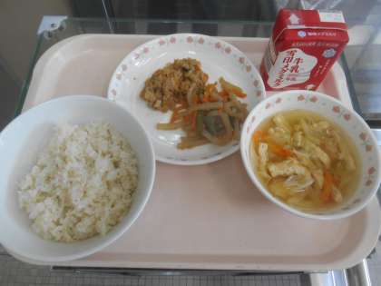 麦ごはん 牛乳 ツナそぼろ丼(具) 野菜のきんぴら キャベツのすまし汁