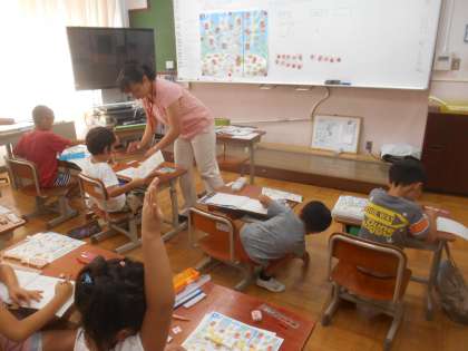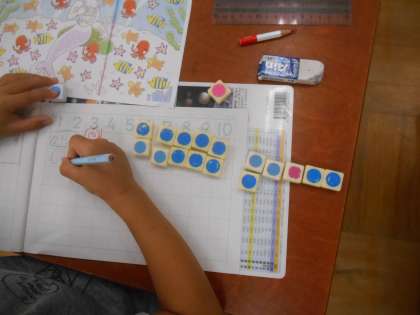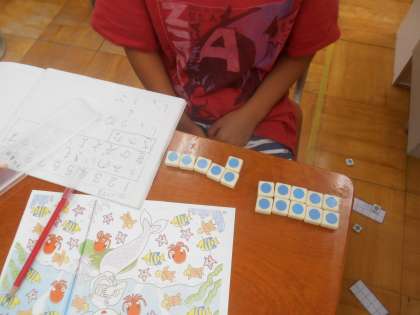 魚の絵と数図ブロックを1対1対応させて数え,「10のまとまり」をつくること、10にならないものは、5といくつを意識した並べ方をして数の理解をすすめていきました。煤図ブロックの並んでいる形を見ると一目瞭然になることや一定の決まった並べ方を身につけることで、きまりにのっとって操作をする力がついていきます。