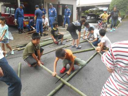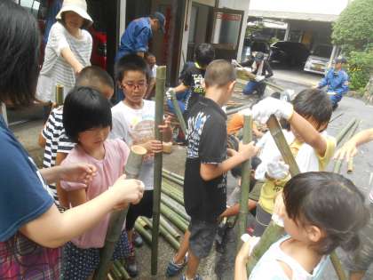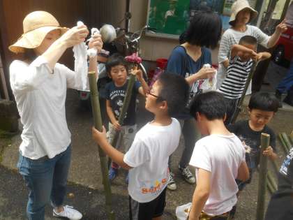 田の虫おくりに向けて、松明つくりをしました。竹を切って、綿の布を詰めていきます。当日は灯油をしみこませて、火をつけます。子ども用の松明です。鋸をはじめはうまく切れませんでしたが、だんだん慣れてくると調子が出てきました。