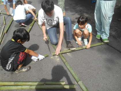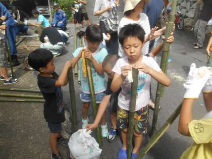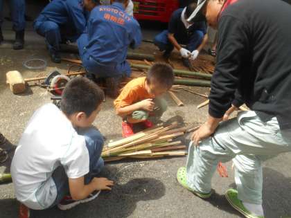 大きな松明は、竹を割って広げた所に木をつめて針金でくくります。子どもには、重たくて持てないです。