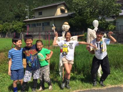 自分たちの田「夢ヒカリ水田」に看板とかかしを設置しました。看板の足には,先日間伐体験で自分たちが切って皮をむかせてもらった材木を使っています。これを機会にもっとたくさんの人に田のことを知ってもらいたいです。稲の世話もやる気が増していきそうです!