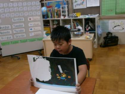 今,朝学習の時間に,国語の学習で作った物語を1年生に読み聞かせをする練習をしています。最初はたどたどしかった読み方も,少しずつですが,登場人物になりきり,言い方を考えてみたり,「ここは強く読むほうがいいですね。」等と強弱や速さなどを気をつけてみたりと工夫を考えながら読めるようになってきました。自分が書いた物語を読み,喜んでもらえるように,一緒に練習を重ねていきたいと思います。