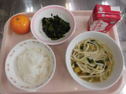 減量ごはん 牛乳 きつねカレーうどん ほうれん草のおかか煮 みかん