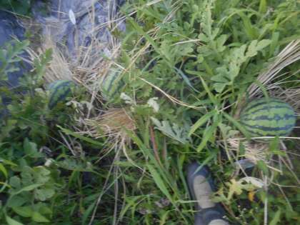 スイカが大きく膨らんできています。スイカの下に藁を敷きました。