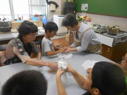 地域の方にお世話になりまして、草木染を実施しました。絞り染めをする為の絞りをしました。どのような模様になるか楽しみです。