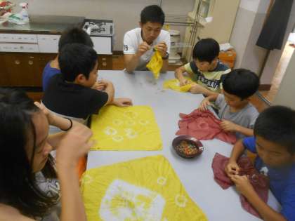 絞りをほどくと、模様が分かります。きれいな出来栄えに興奮しています。黄色いのがウコン、赤いのがアカネ、そしてオレンジのようなのが玉ねぎです。しっかり色がつき模様もよくわかりました。