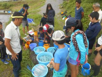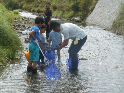 静原川にいる生き物から、水質を確かめます。生き物の説明もしていただきますので、生き物にも親しみがわいてきます。サワガニの雄雌やつかみ方、卵を育てる様子など教えていただきました。たくさんの生き物を分類して説明していただきました。
